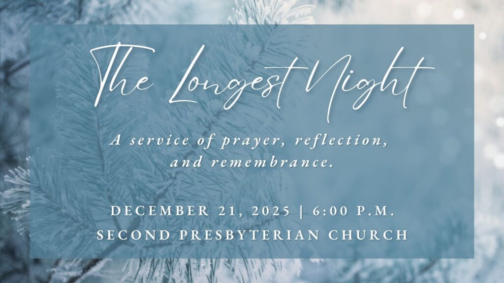 On Sunday, December 21 at 6:00 p.m. in the Sanctuary, we will hold a Longest Night service of prayer, song, and meditation. Our hope is that this worship service will create a safe and sacred space for those who are struggling to feel the joy and light of this Advent and Christmas season due to loss of any kind.